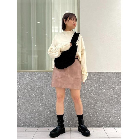 白色針織衫加上粉色裙子,為了不太甜,所有的小物件都用黑色統一了♪
