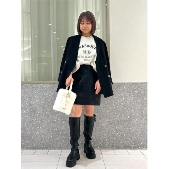 在黑色夾克上加上運動服和皮革裙子,打造了成熟休閒的搭配♪